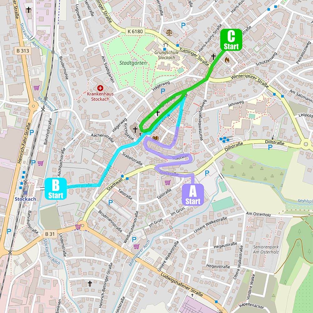 - Route B: Schillerstraße > Goethestraße > Kirchhalde > Hauptstraße > Marktplatz > Kaufhausstaße > Gustav-Hammer-Platz